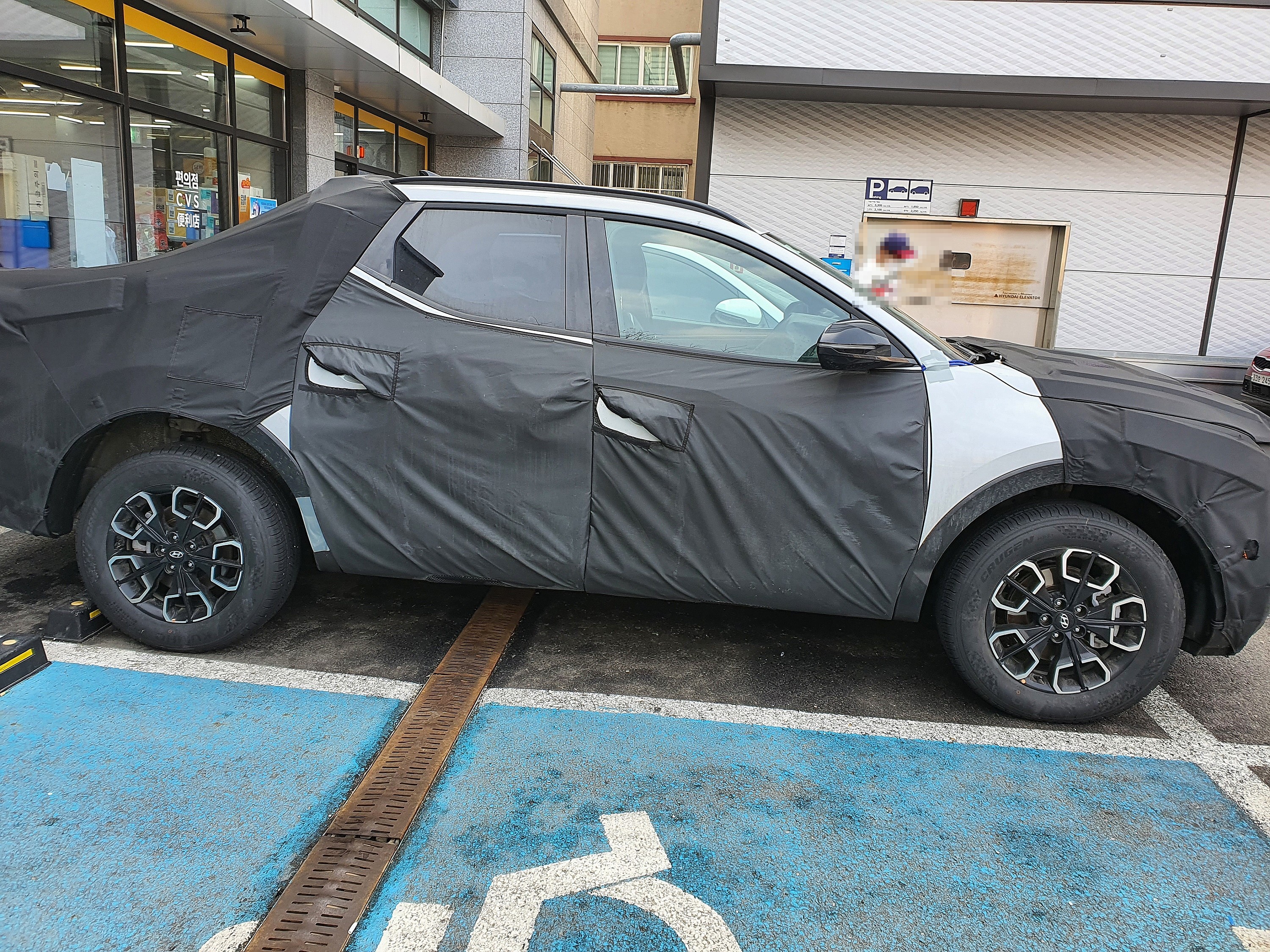 국내 주차장에서 포착된 테스트 차량의 경우 주차 구획 안쪽으로 들어와 있는 차체를 볼 수 있는데, 크기를 가늠할 수 있습니다.