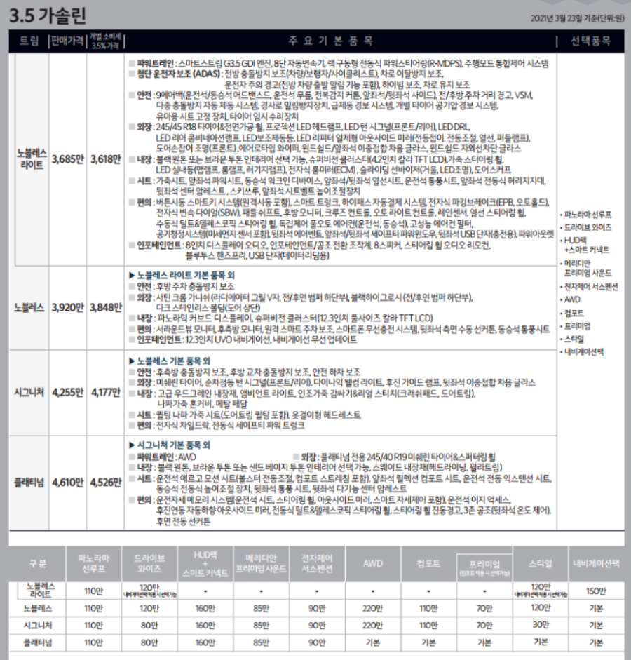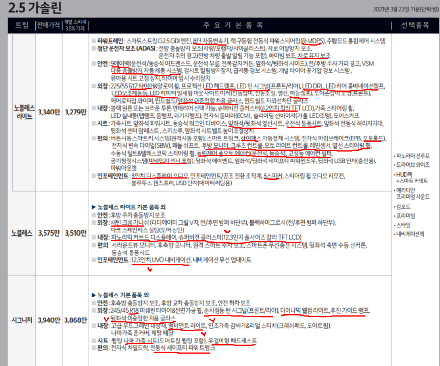 세부적인 기능 설명을 2.5 엔진에서 설명을 드렸기 때문에 한번씩 보시고, 옵션 가격도 트림과 2.5 엔진과 조금 차이가 있다는 점도 꼼꼼하게 체크해 보세요!