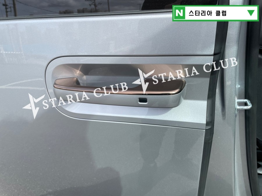 실내에 들어가기 위한 핸들에도 스타리아의 핵심 컬러인 틴티드 브라스 크롬 컬러를 볼 수 있습니다.