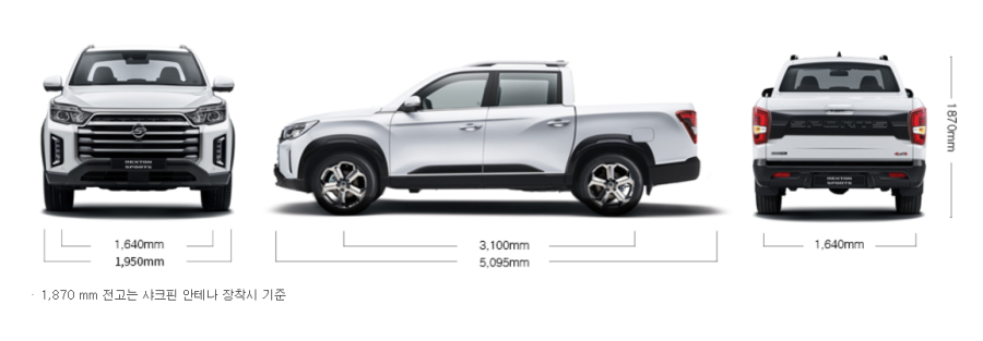 또한 픽업트럭을 대표하는 쌍용차 렉스턴 스포츠와 비교해 보면 두 차량의 전장 차이는 125mm 로 차이가 발생됩니다.