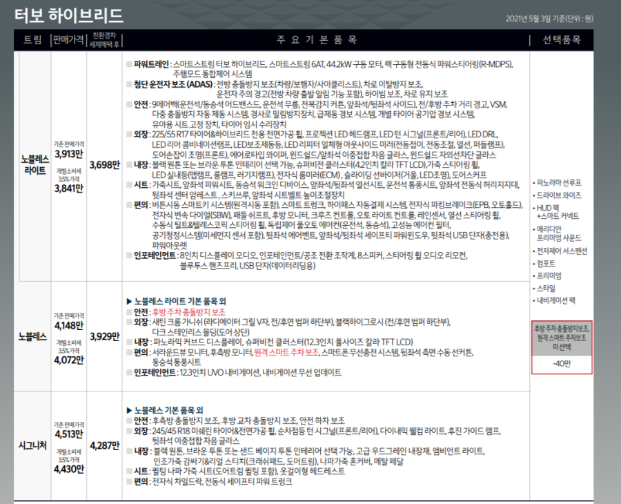 하이브리드는 3개의 트림 중에서 기본 트림 3698만 원, 중간 트림 노블레스 3929만 원, 고급 트림 시그니처 4287만 원입니다.