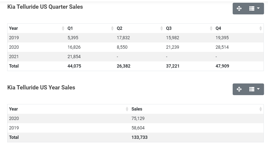 연도별 텔루라이드의 판매량을 보면 2019년도에 58604대, 작년인 2020년도에 75129대를 판매했고, 올해는 1분기에만 3만 대를 넘겼기 때문에 최소로 예상해도 10만 대가 넘어갈 것으로 예상할 수 있습니다.