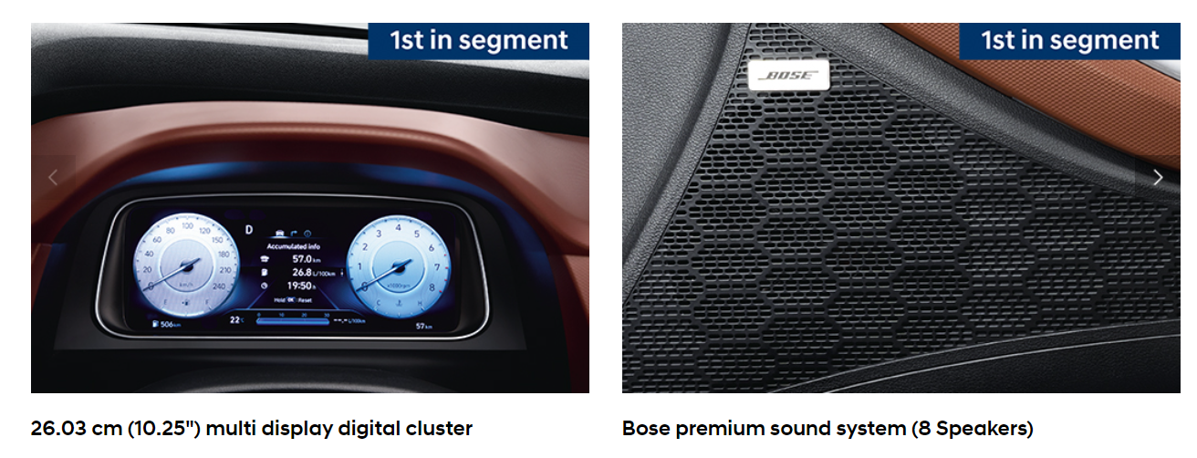 하나씩 보면, 투싼과 동일한 UI를 제공하는 10인치 계기판과 8개의 스피커를 장착된 보스 오디오가 제공됩니다.