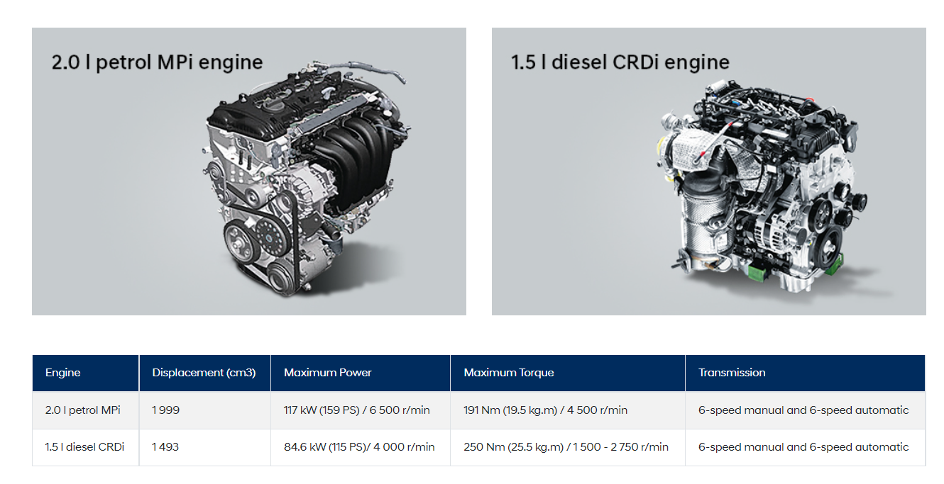 총 4개의 파워트레인이 제공되는데, 2.0 가솔린 엔진은 엘란트라부터 검증받은 엔진으로 159마력에 19.5 토크를 발휘하고, 1.5 디젤 엔진은 115마력에 25.5 토크를 발휘합니다.