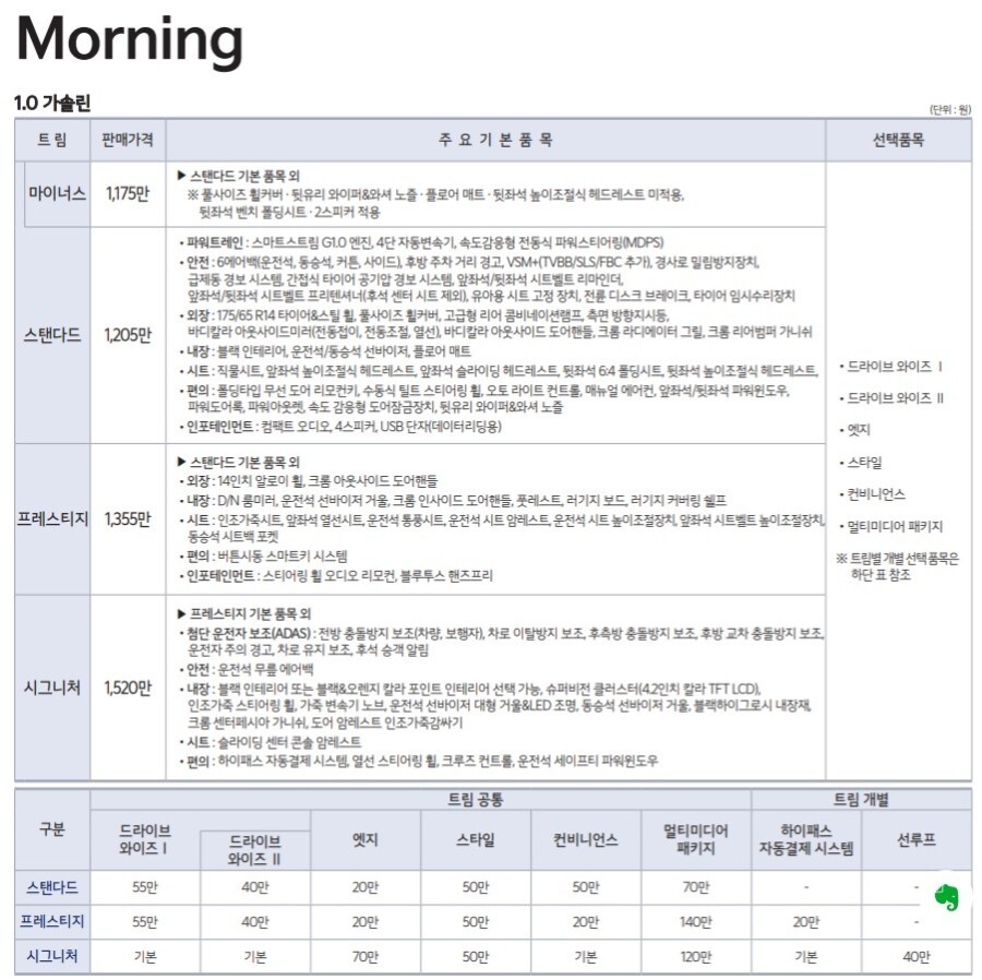 경차를 대표하는 모닝 기본 사양을 보면, 에어컨, 6개 에어백, TPMS가 기본으로 제공됩니다.