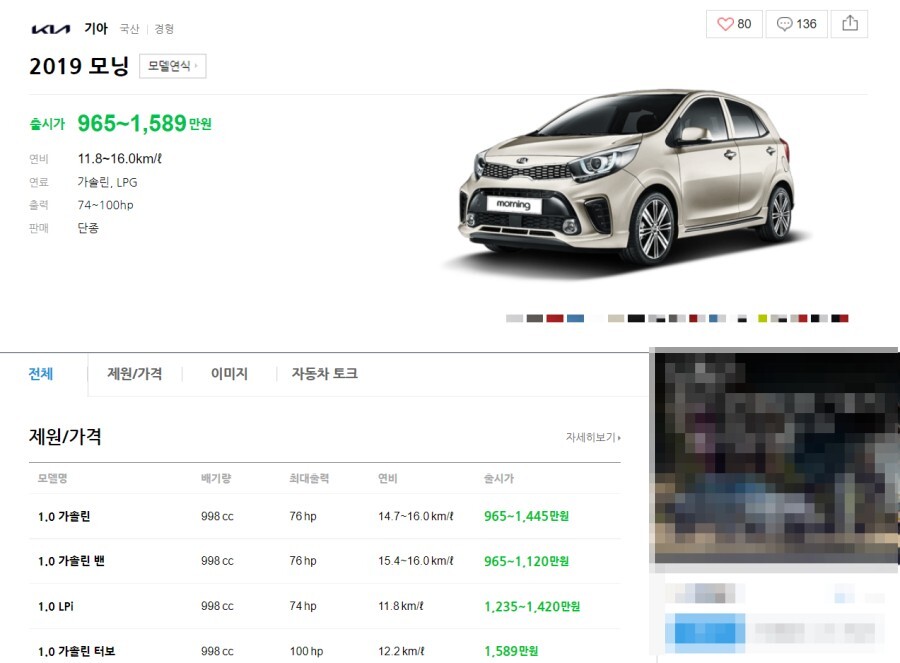 경쟁 차량인 모닝는 2019년 형에 가솔린 터보가 제공되었습니다.