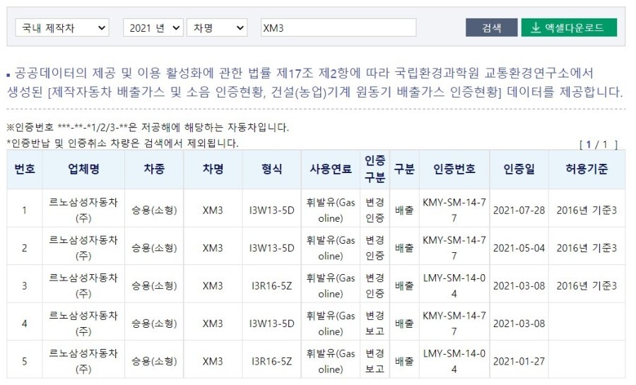 공식 출시가 되지 않은 상황이지만 르노삼성 사장님이 언급을 했기 때문에 혹시나 배출 가스 인증을 받고 있지 않을까?
