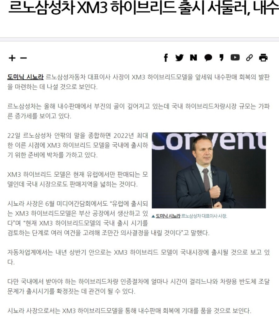 그런데 정작 내수 시장에서는 XM3의 선전에도 불구하고 르노삼성의 다른 차량은 힘을 못 쓰고 있는 상황이라서 시장에서 높은 인기를 얻고 있는 XM3 하이브리드를
