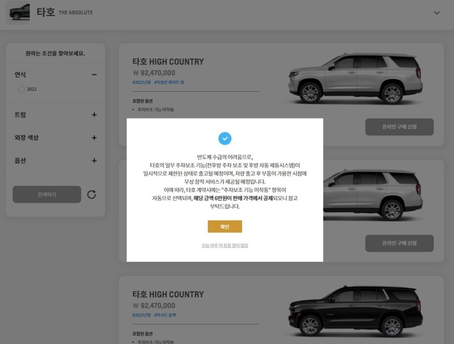 아직 제네시스의 공식 입장은 없지만 최근 출시될 쉐보레 타호의 경우 반도체 수급 등의 이유로 주차 보조 기능은 제한된 상태로