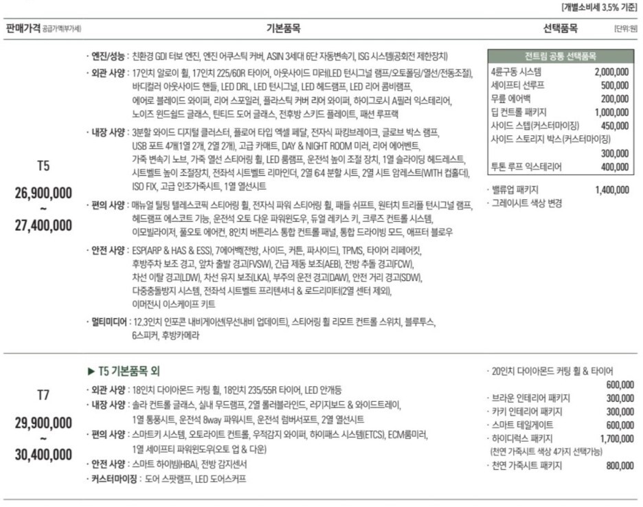 기본형 T5는 2690만원에서 시작하고 고급형 T7 2990만원에서 시작합니다.