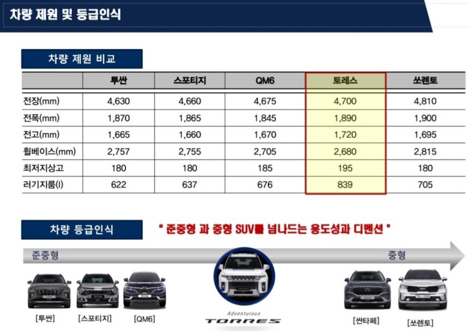 다만 쌍용의 라인업으로 적용해 본다면 코란도 준중형, 토레스가 중형, 렉스턴이 데형 SUV가 되면서