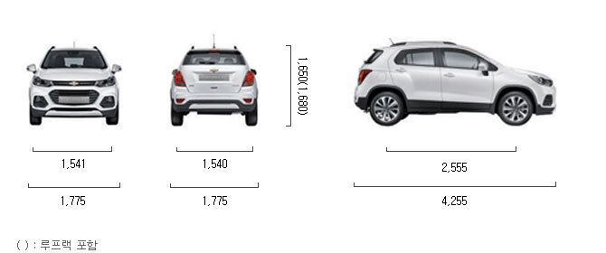 기존 트랙스의 제원은 전장 4255 전고 1650 전폭 1775 축거 2555mm의 차량이었습니다.