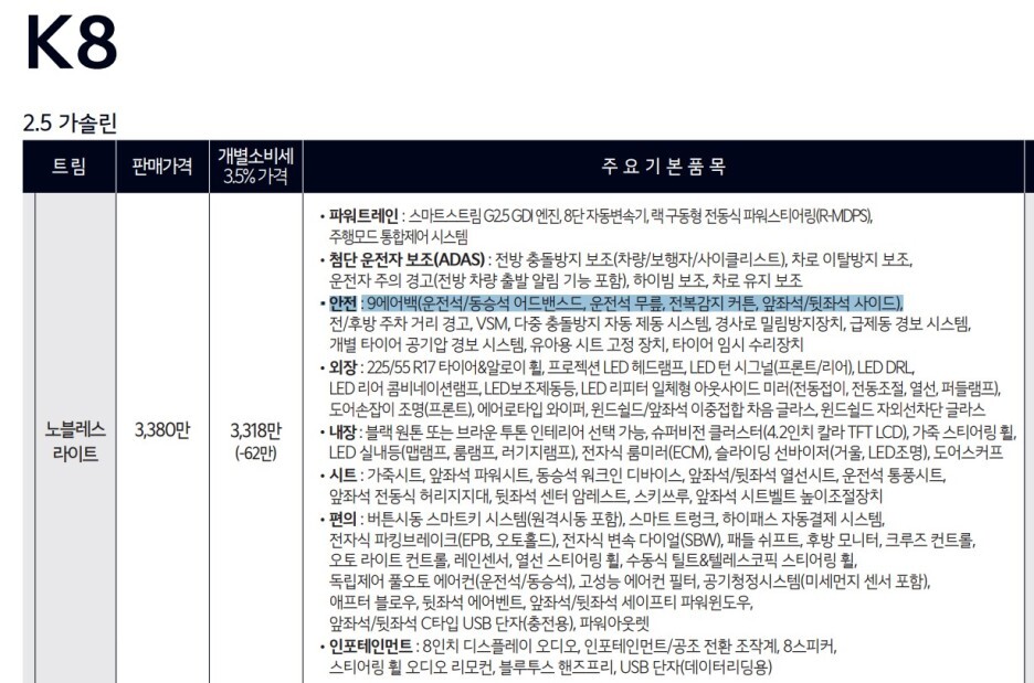 신형 그랜저는 10개의 에어백을 제공합니다. K8은 9개를 제공하는데..