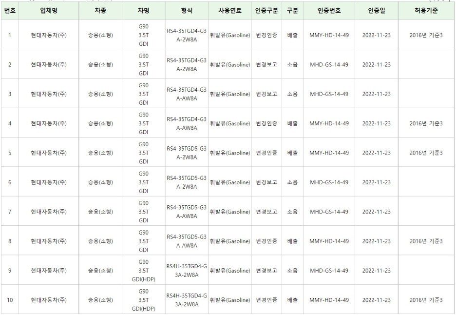 지난주에 따끈따끈하게 G90 3.5 T 가솔린 차량의 인증이 완료된 것을 확인할 수 있네요.