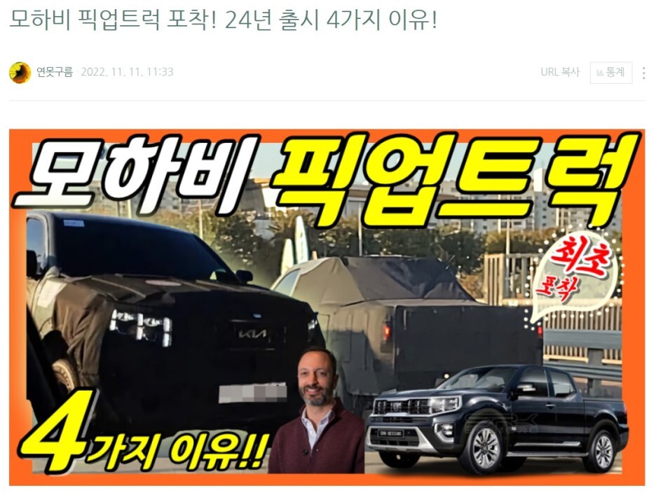 그리고 최근 국내 커뮤니티에 새로운 모하비 픽업트럭 테스트 뮬이 또 포착되었습니다.