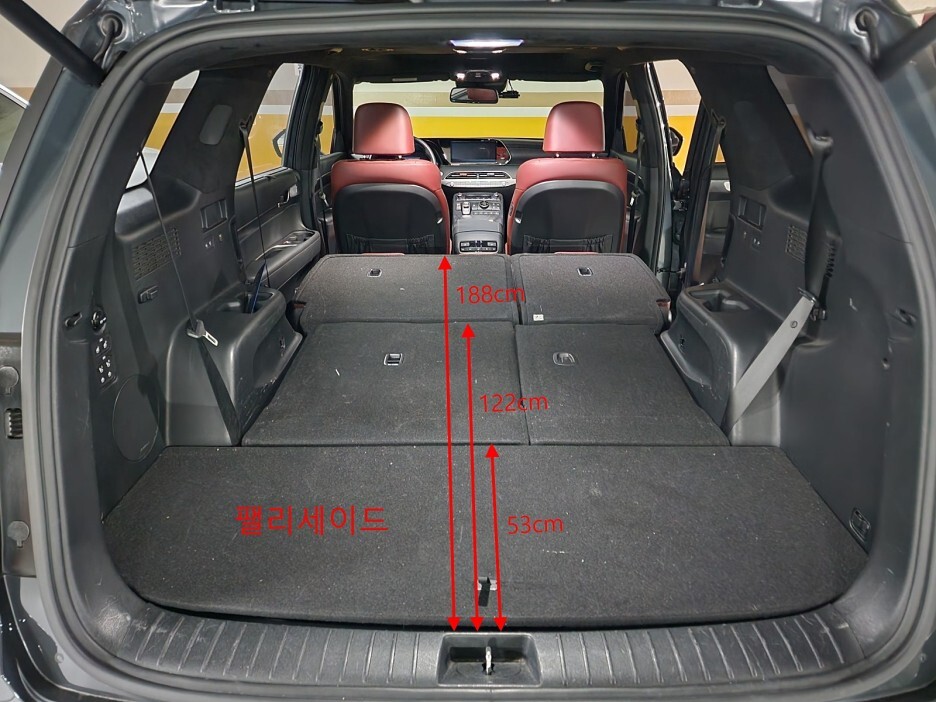 내연기관 팰리세이드 3열 시트까지 길이는 122cm이며, 트렁크 바닥 쪽 길이는 53cm입니다.