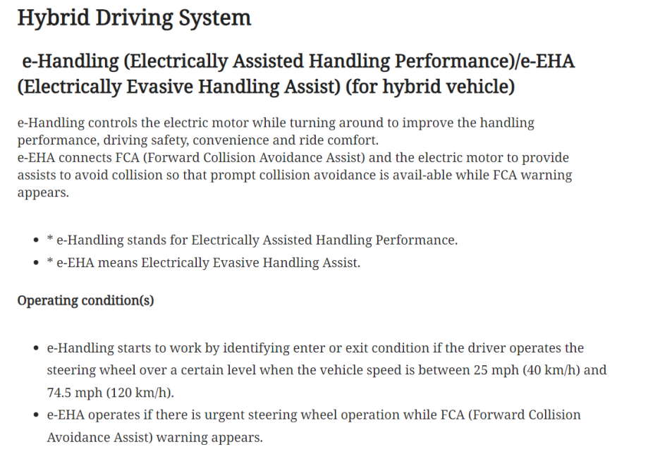 주행 성능을 개선하는 기술은 E-EHA입니다. Electrically Evasive Handing Assist의 약자로,