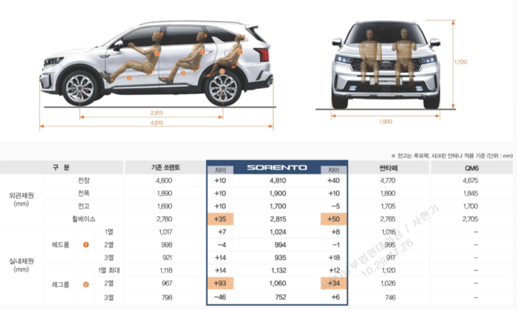 쏘렌토가 처음 출시가 되었을 때에 영업소에 비치된 세일즈 가이드를 보면 쏘렌토가 경쟁인 싼타페나 QM6 보다 실내 제원이 더 크다는 것을 강조했죠?