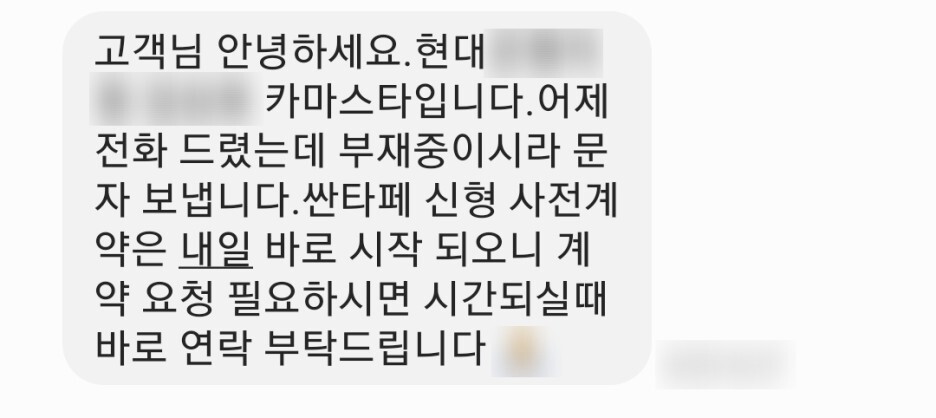 제가 현대자동차 카마스터에게 받은 메시지입니다.