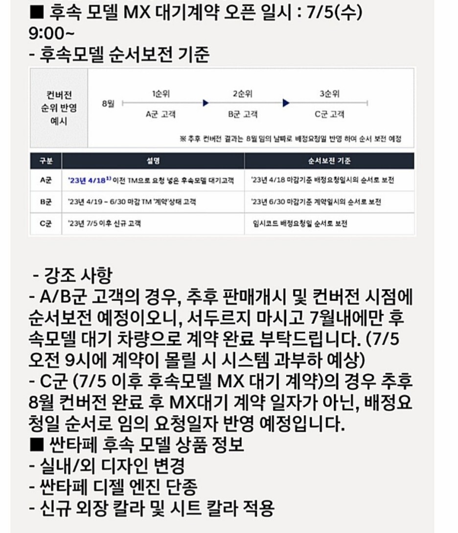 3가지 타입이 존재합니다. 첫 번째는 올해 즉 23년 4월 18일에 기존 싼타페 TM을 계약했으나 현시점까지 출고 받지 못한 분들이 신형 싼타페로 컨버전을 하는 경우 최우선 배정을 받게 됩니다. 이게 바로 A 군입니다.