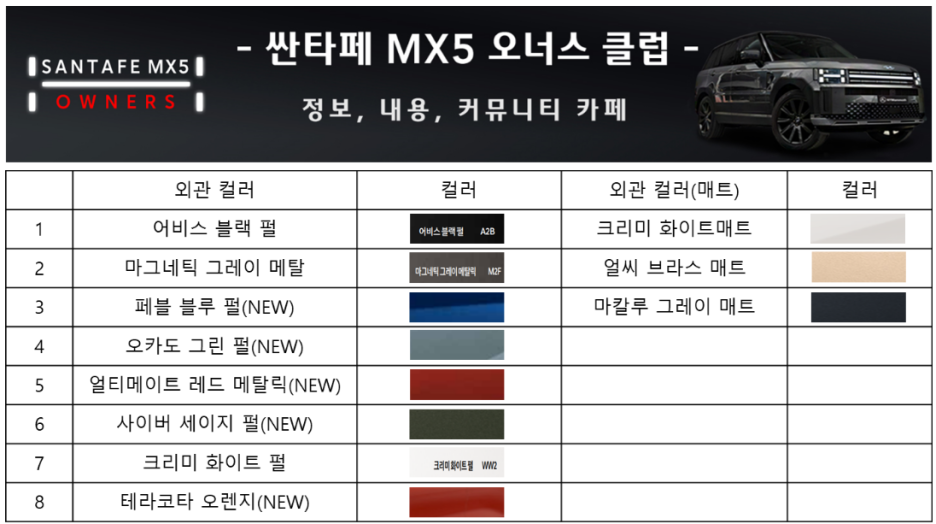 신형 싼타페의 정확한 정보를 제공하는 싼타페 MX5 오너스 클럽에 업데이트된 외장 컬러 색상에 대해서 이전 영상에서 알려드렸습니다.