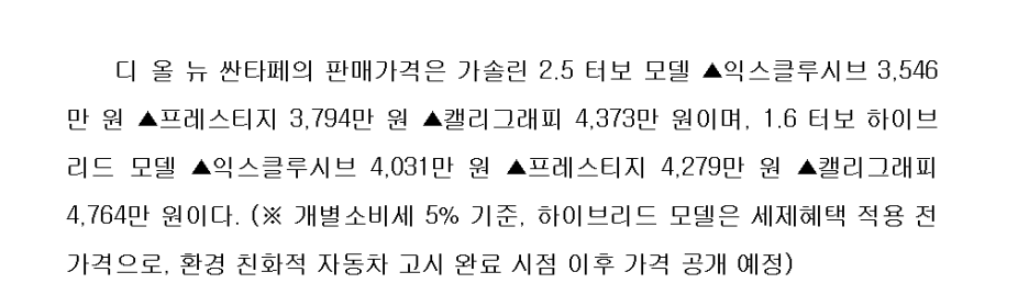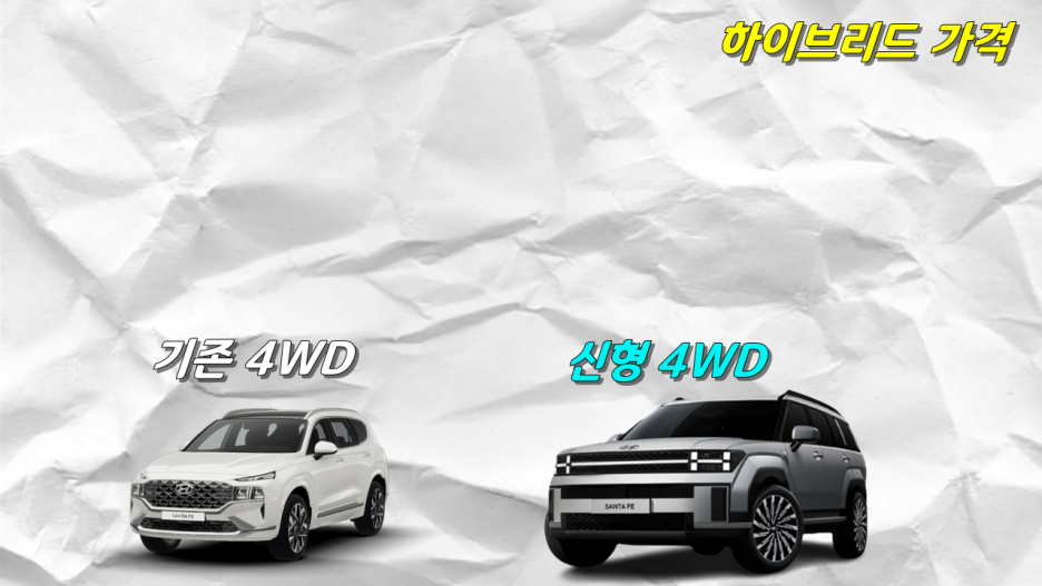 익스클루시브 4254만원, 프리스티지 4502만원, 캘리그래피 5036만원으로 처음으로 싼타페에서 기본 트림 가격이 5천만원을 넘었습니다.