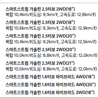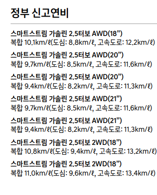 가솔린 2.5 터보 최고 연비는 18인치 2륜 기준 복합 11km입니다. 4륜 18인치 기준 복합 10.1km입니다.