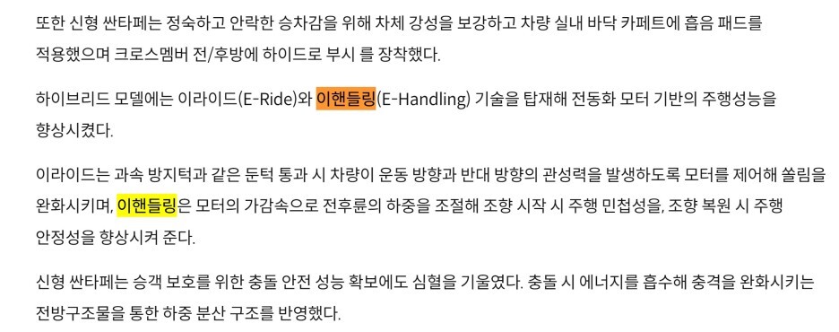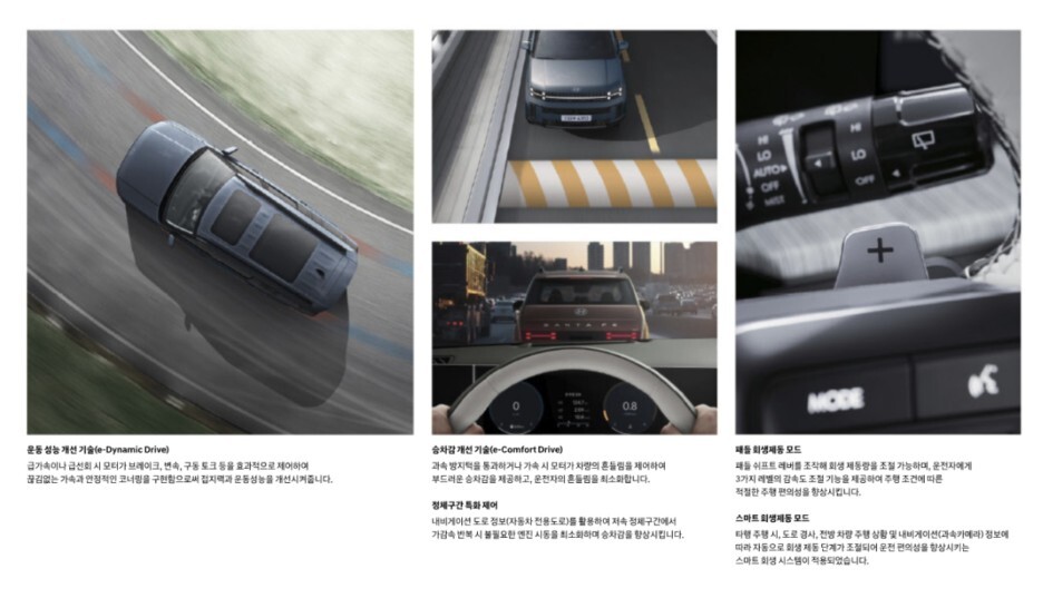 이걸 하이브리드 모터를 통해서 감속과 가속을 구현한 기술입니다. 이런 기술 덕분에 승차감이 좋아집니다.
