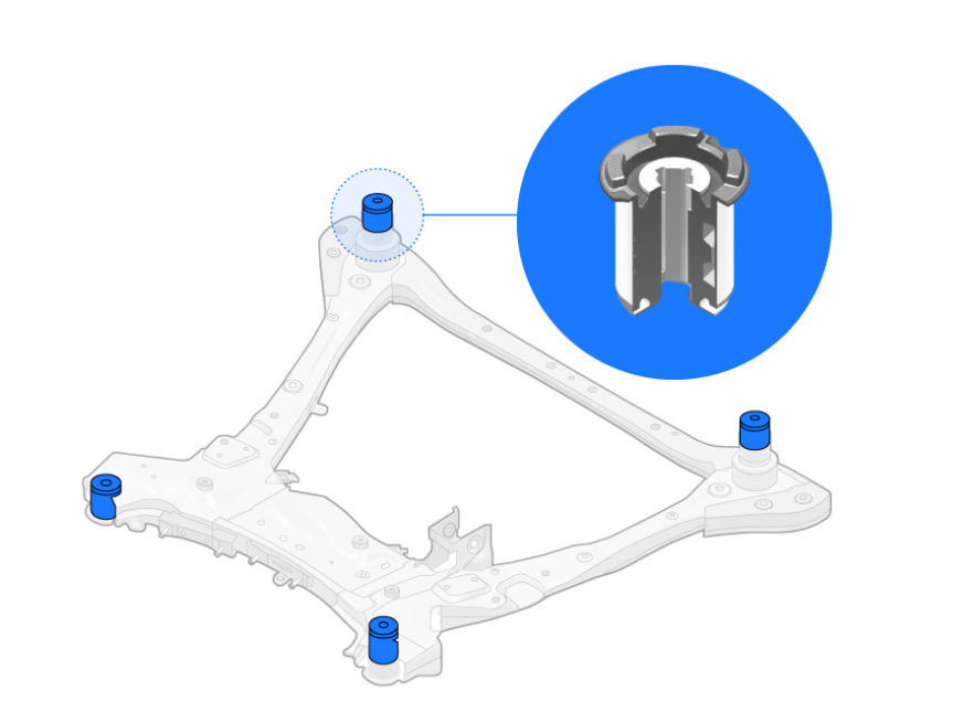크로스멤버가 이렇게 생겼는데, 접지 포인트에 하이드로 부시를 적용하면, 진동과 특정 주파수를 감쇄하기 때문에 승차감이 개선되게 됩니다.
