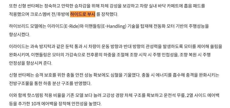 디자인은 취향이구요! 그래서인지 채널에도 어떤 차량을 구입할지 문의가 많습니다. 만약에 여러분이 하이브리드 엔진을 구입하면서 승차감을 최우선으로 고려한다면 싼타페에 적용될 이 기술에 주목해 보세요!