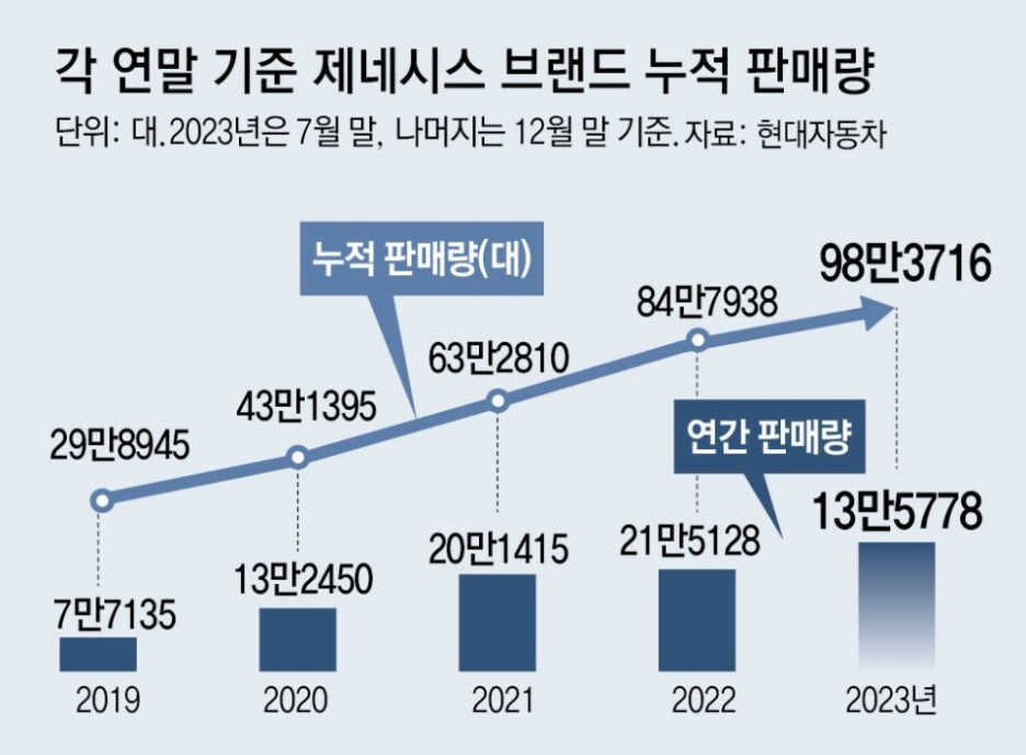 이번 달 9월 17일 기준 제네시스가 글로벌 포함 누적 판매 100만대를 드디어 돌파했습니다.