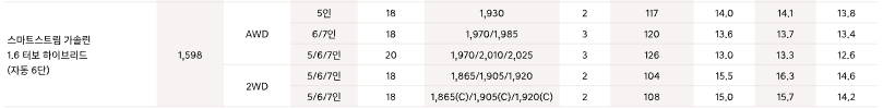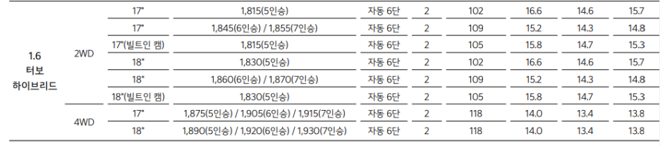 가장 많이 구입하는 하이브리드의 경우 1.6 가솔린 터보엔진에 235마력 37.4토크 복합연비는 15.5km/L입니다.
