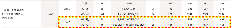 반면 AWD 차량은 18인치나 20인치 모두 친환경차 해택 기준을 충족하지 못합니다.