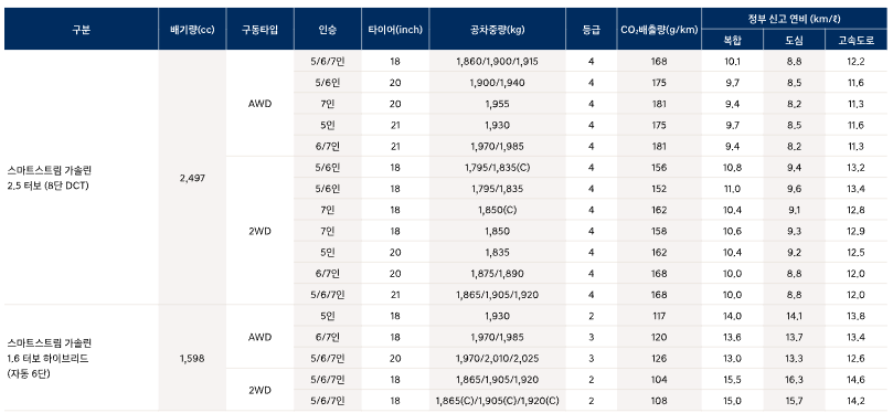가장 큰 엔진이면서 기본 모델인 2.5 가솔린 터보의 경우 281마력 43토크 복합연비는 11km/L를 주행할 수 있습니다.