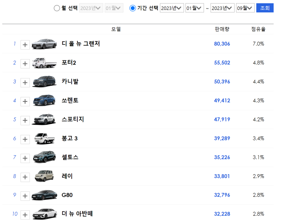 높은 인기는 판매량이 보여주는데, 최근 출시되어서 신차 효과를 누리고 있는 그랜저를 제외하고 자영업자를 대표하는 포터 다음에 누적으로 3위 판매량을 차지하고 있습니다. 대단한 판매량이죠?