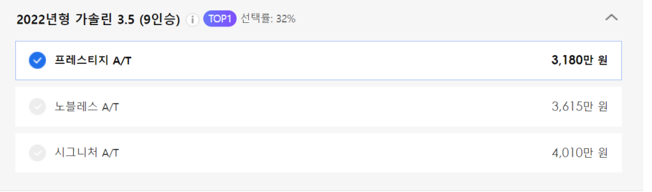 가장 많이 구입하는 가솔린 3.5 9인승의 가격은 3180만원~4010만원입니다.