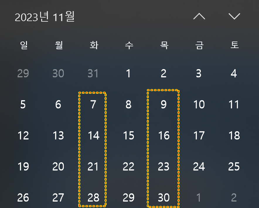 화요일이라면 7일 또는 14일과 21일 목요일이라면 9일 또는 16일과 23일 정도가 예상됩니다.