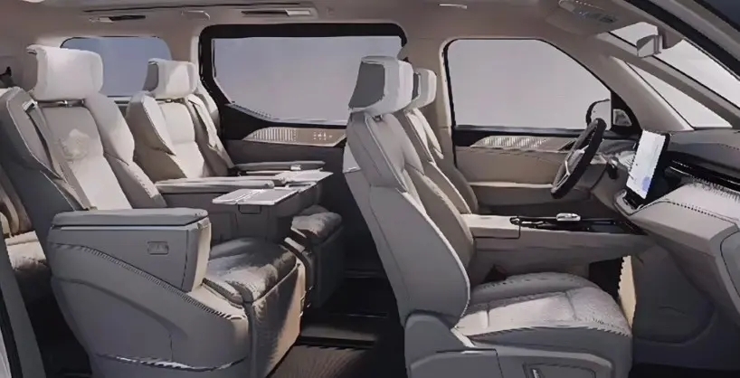 반면 EM90은 가로형 인포테인먼트가 제공됩니다. 사이즈는 15.4인치 노트북을 펼쳐놓은 것 같은 커다란 디스플레이가 제공됩니다. 실내 공간은 5미터가 넘는 미니밴 답게 정말 여유롭고 안락한 느낌의 시트를 볼 수 있는데 시트 헤드레스트에는 마치 스피커가 장착되어 있을 것 같은 디자인입니다.
