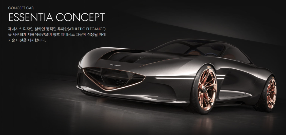 세번째는 #에센시아콘셉트 로 동적인 우아함! 현재 제네시스를 상징하는 말이 되었는데.. 에센시아 콘셉트부터 시작된 표현이죠?