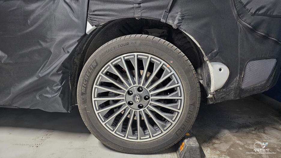 이유는 21인치 사이즈이며 285 45 R21인치이며 미쉘린 프라이머스 튜어 AS 타이어가 장착되어 있습니다. 제네시스 브랜드에서도 볼 수 있는 타이어인데 해당 타이어는 어쿠스틱 타이어로 흡음 폼 타이어로 노면에서 올라오는 소음을 대폭 줄인 타이어입니다.