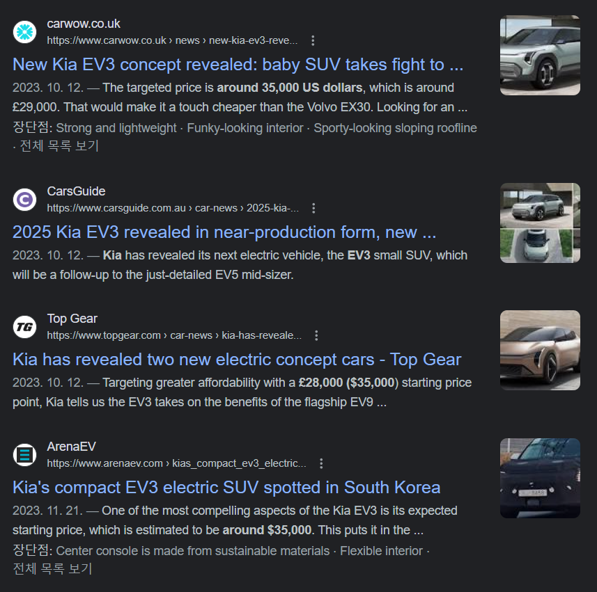 4천만원이 조금 안되는 가격대라고 할 수 있는데.. 전기차의 보조금까지 받게 된다면 3천만원 중반대에 꽤 매력있는 전기차를 구입할 수 있기 때문에 전기차의 대중화를 이끌 모델이 EV3 라는 결론에 도달하게 되죠?