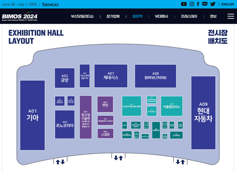 부산 모빌리티쇼는 좌측에 기아 우측에 현재가 커다란 규모의 행사장을 진행하며, 위로 중간에 제네시스와 수입차 메이저 브랜드로 유일하게 BMW가 참가합니다.