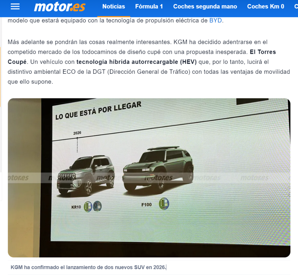기사 원문의 내용을 보면 2025년도에 스페인에 도착한 KGM 신제품에는 전기차 2대와 SUV 쿠페가 포함되어 있다고 합니다.