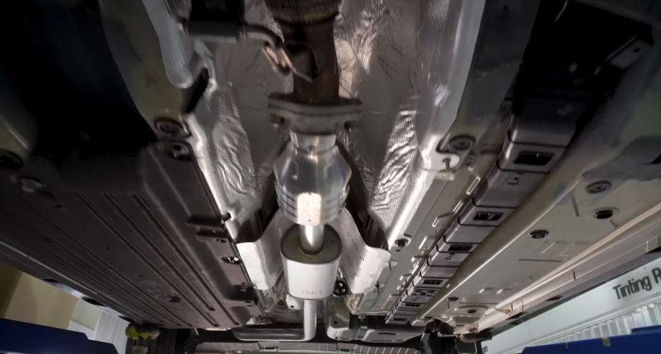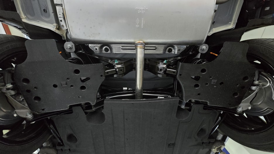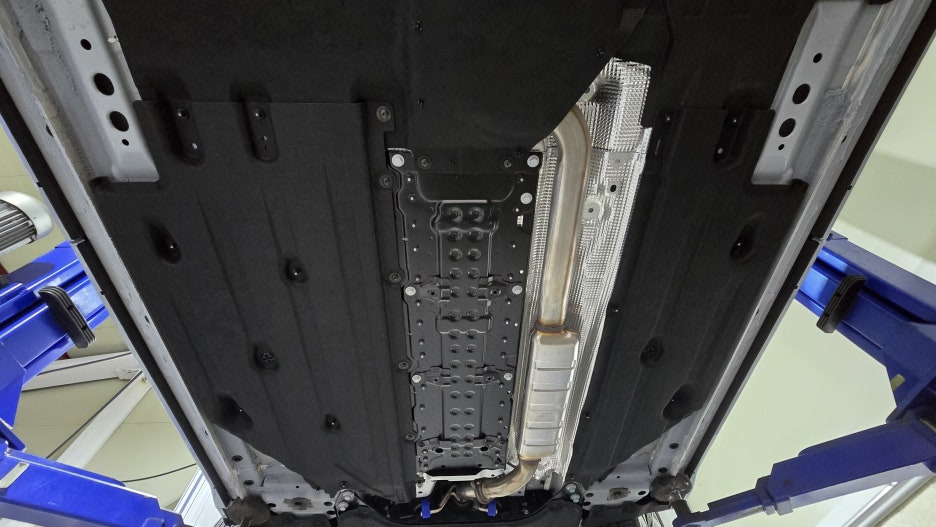 참고로 국내 중형급 차량의 하체입니다. 배기관이 지나는 상부를 보면 자체에 방열처리를 한 것이 아닌 배기관 상부에 작은 철판으로 방열처리했죠?