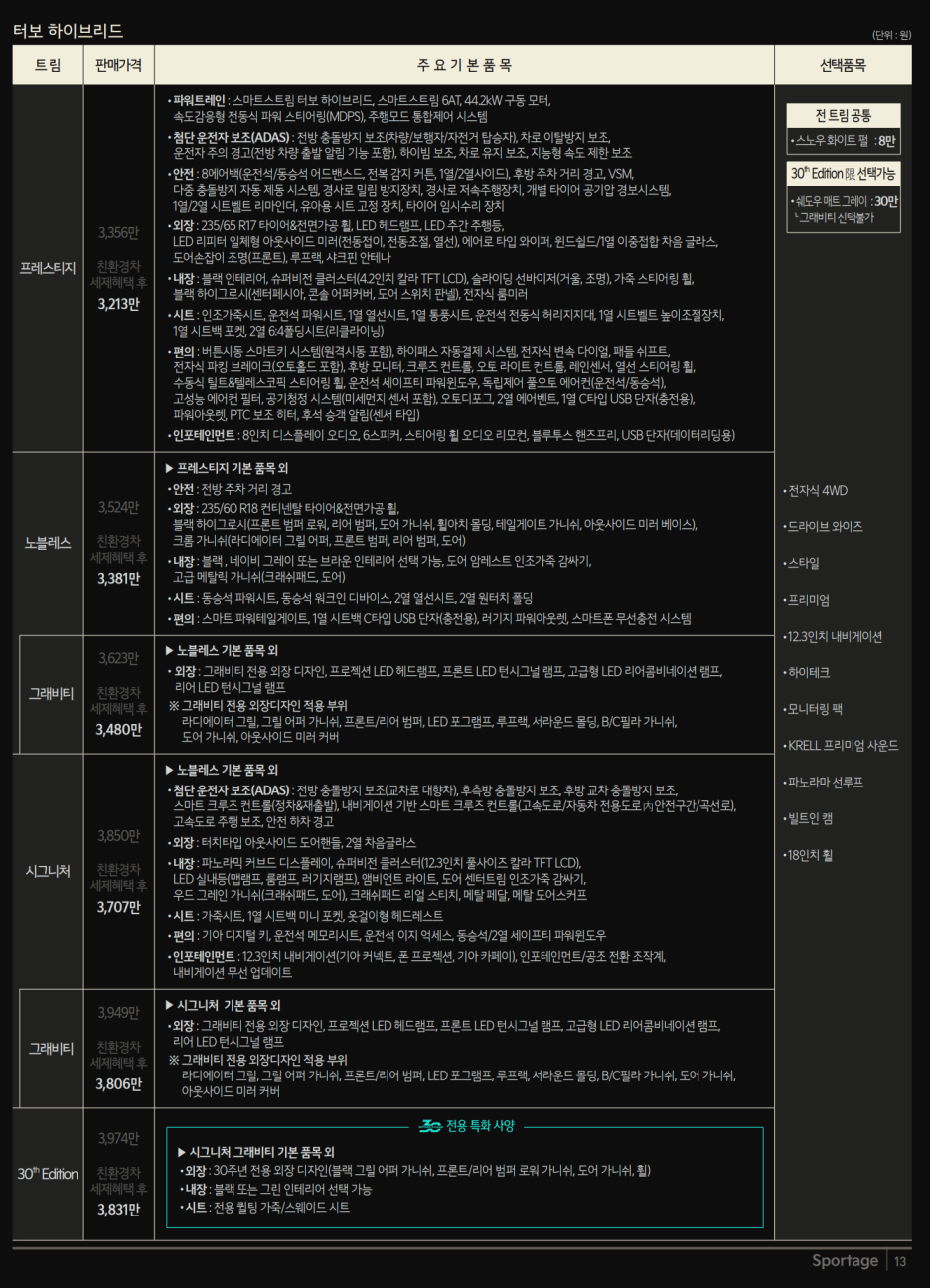 또한 하이브리드는 기본트림 프레스티지 3213만원으로 매력이 있었죠? 시작 가격은 공식 가격이 발표되면 기존 가격표는 볼 수 없으니 세부적으로 비교해 드리기 위해서 박제해 놓겠습니다.