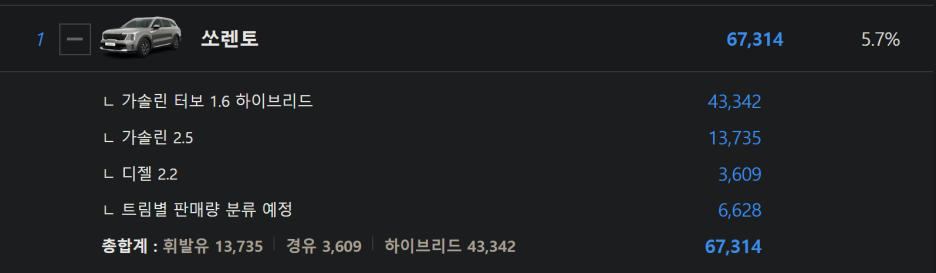 중형 SUV 1위 쏘렌토의 올해 판매량을 보면 67314대중에서 무려 64% 이상이 하이브리드 파워트레인으로 판매가 되었습니다.