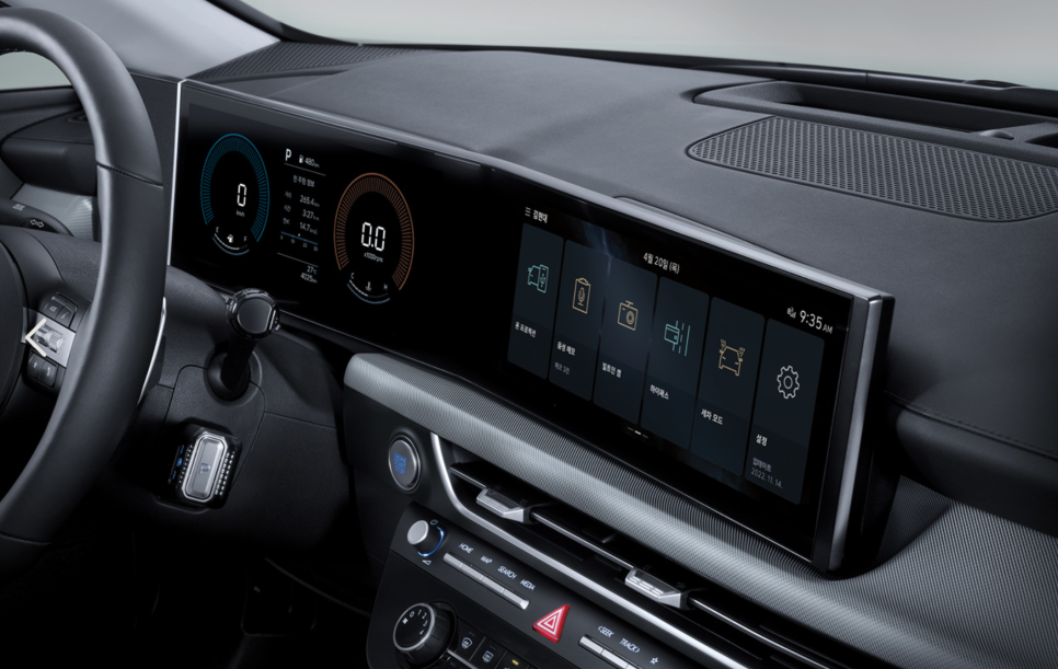 중간이 꺾인 통합형 디스플레이는 현대차와 기아에서 볼 수 있는 디자인으로...