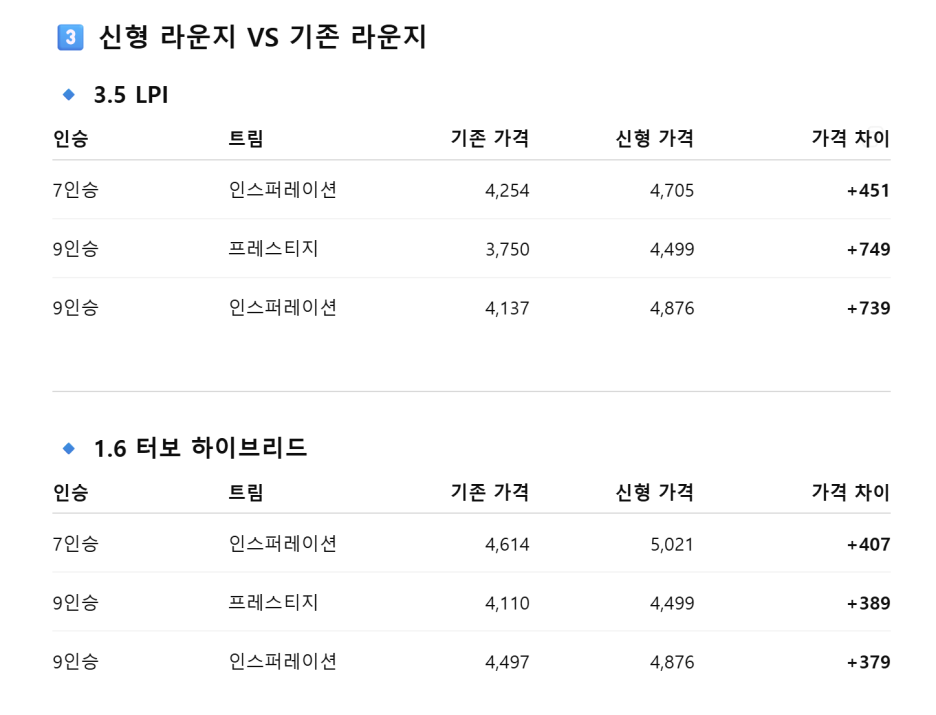 그래서 정말 중요한 건 가격이죠! 가격은 ADAS와 외부 디자인, 실내 인포테인먼트 등이 달라지면서 대략 300만원 정도 인상되었습니다.