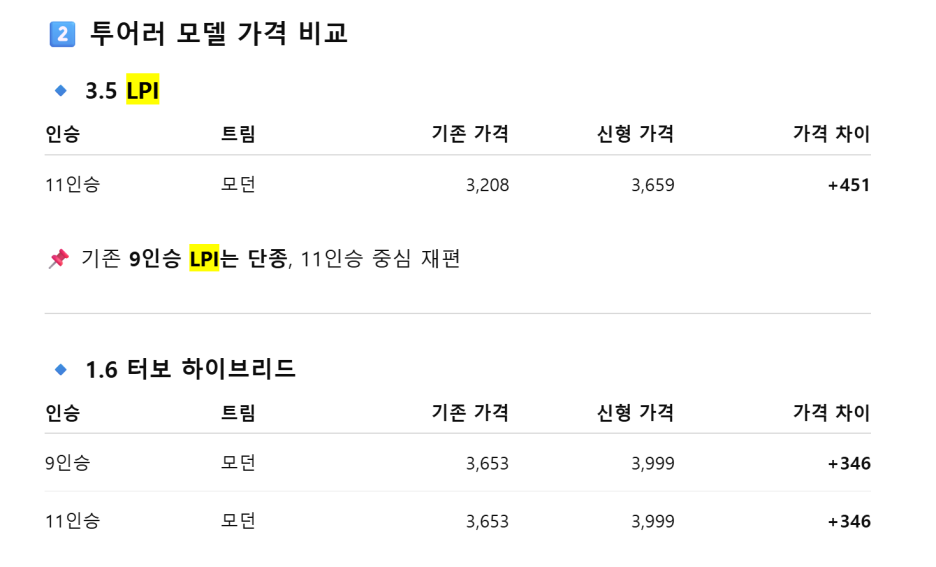 이번에 인승을 포함한 라인업이 대폭 달라지면서 가격을 비교하는데 애를 먹었는데.. 인승이 다르기 때문에 직접 비교는 아니고 조금 틀릴 수 있다는 점을 감안하시고 보세요!