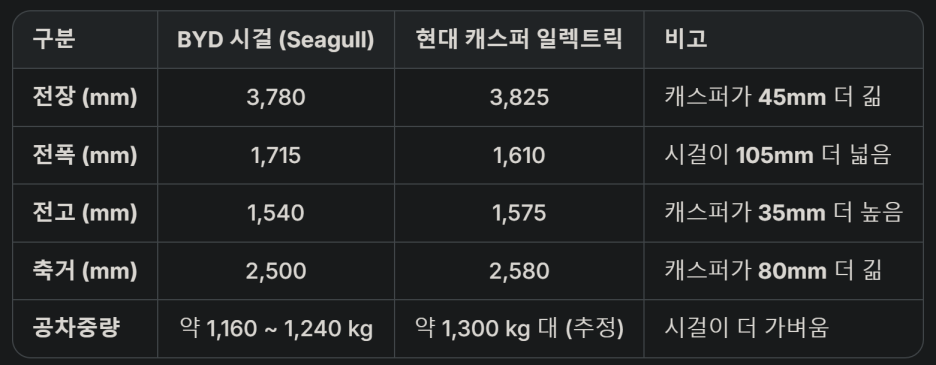 전장 전고 축거를 캐스퍼 일렉트릭이 조금씩 넓지만 전폭은 오히려 씨걸이 105mm가 넓기 때문에 좀 더 안정적인 주행 성능을 기대해 볼수 있습니다.